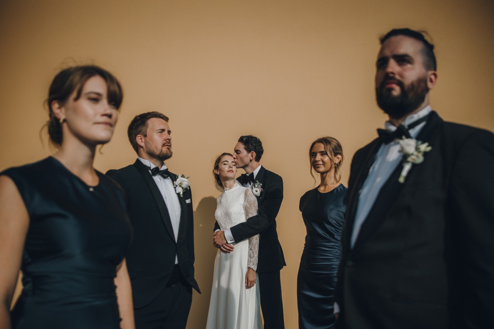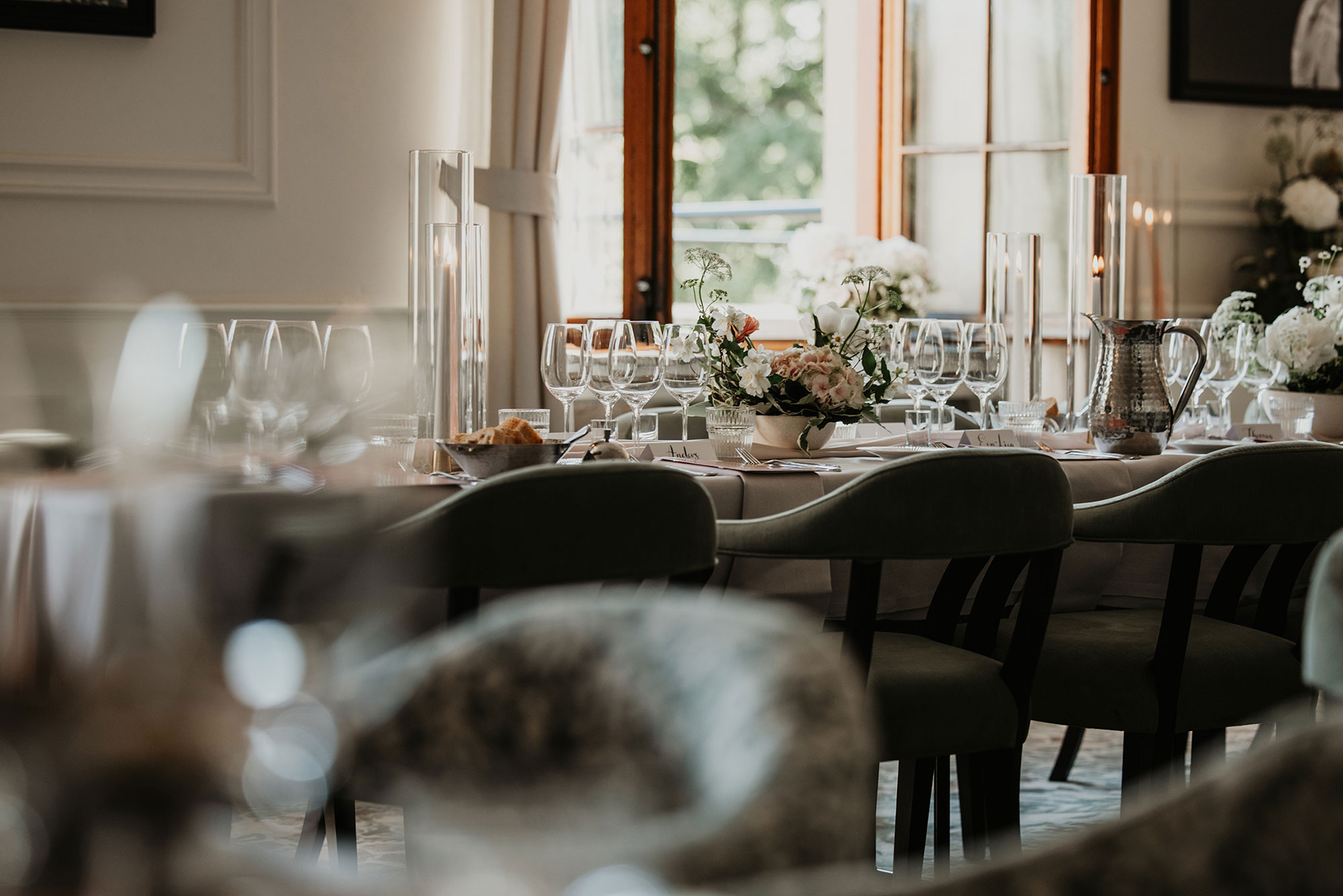 Under minglet fångar jag spontana ögonblick mellan era gäster, samtidigt som jag dokumenterar lokalen, miljön och den vackra dukningen. Innan middagen tar vi även de formella gruppbilderna med familj och vänner, så att alla viktiga personer är med på bild utan stress. Resultatet blir både avslappnade mingelbilder och stilfulla minnen av er bröllopsdag.
